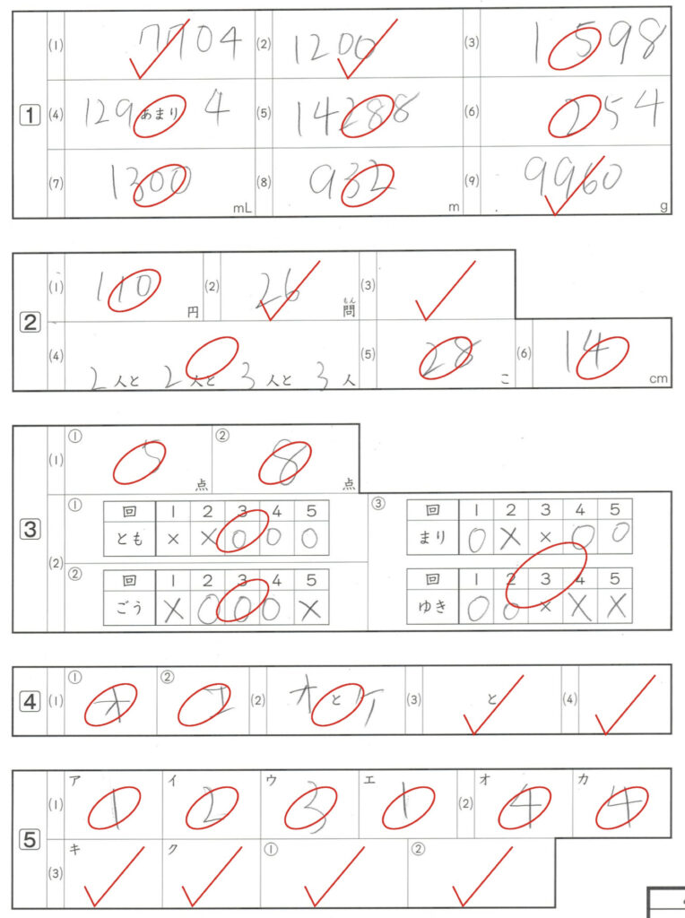 特に5⃞の(3)①②はグーかチョキかパーの3択で、完答ではないので、何か書いておけば当たる可能性があります。それに関しては、我が子は「あー、そっかー」と納得した様子でした。テスト慣れしていないのが、そのまま出てしまった感じです。