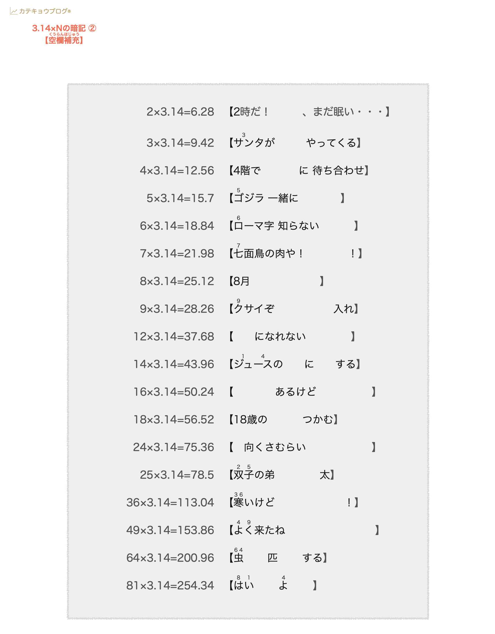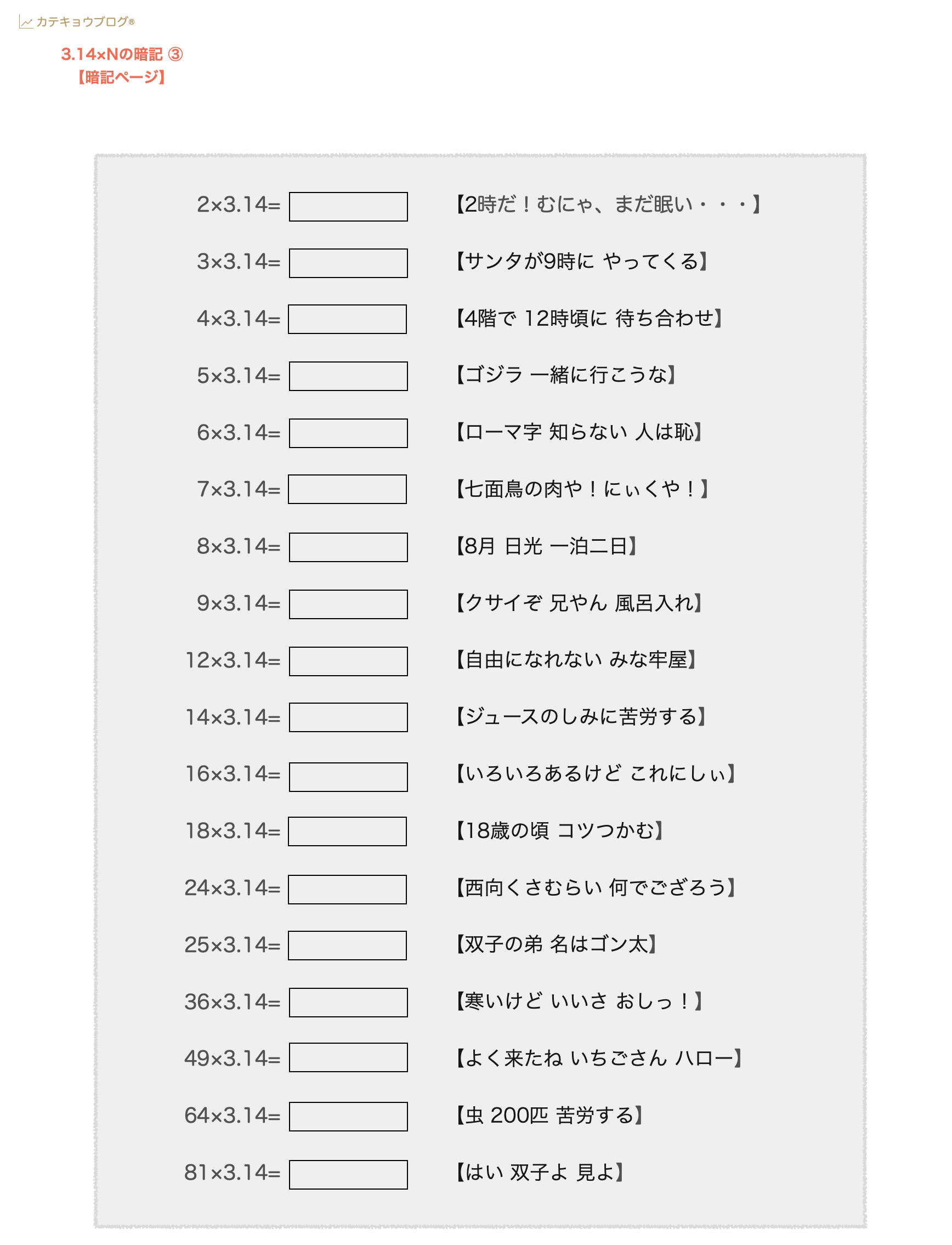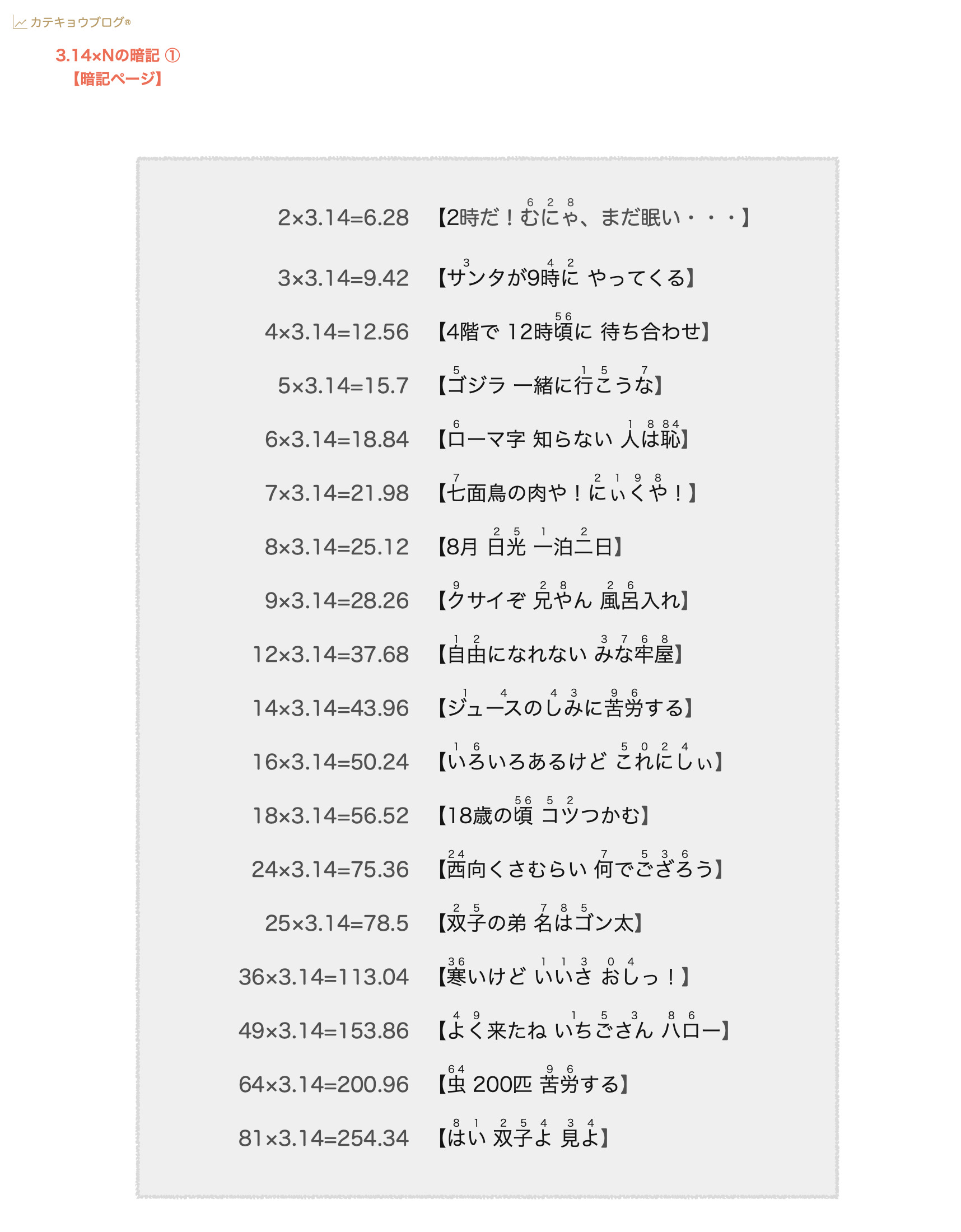 この暗記は3.14が出てきてすぐ、4年生のうちに終わらせておいてください。