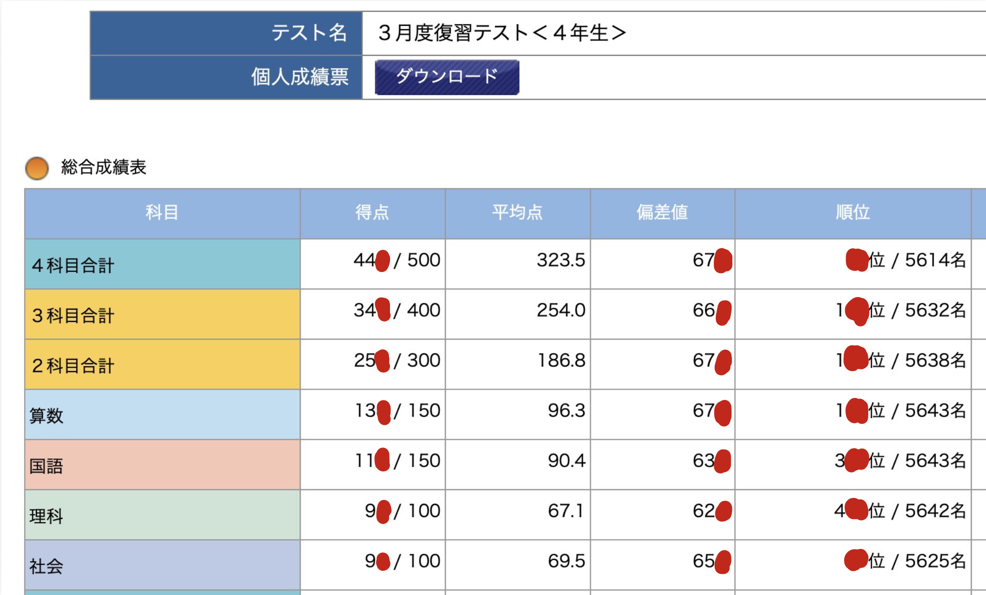新4年の3月復習テストがありました。復習テストなのでクラスの昇降はないのですが、我が家では気合いを入れて臨みました。