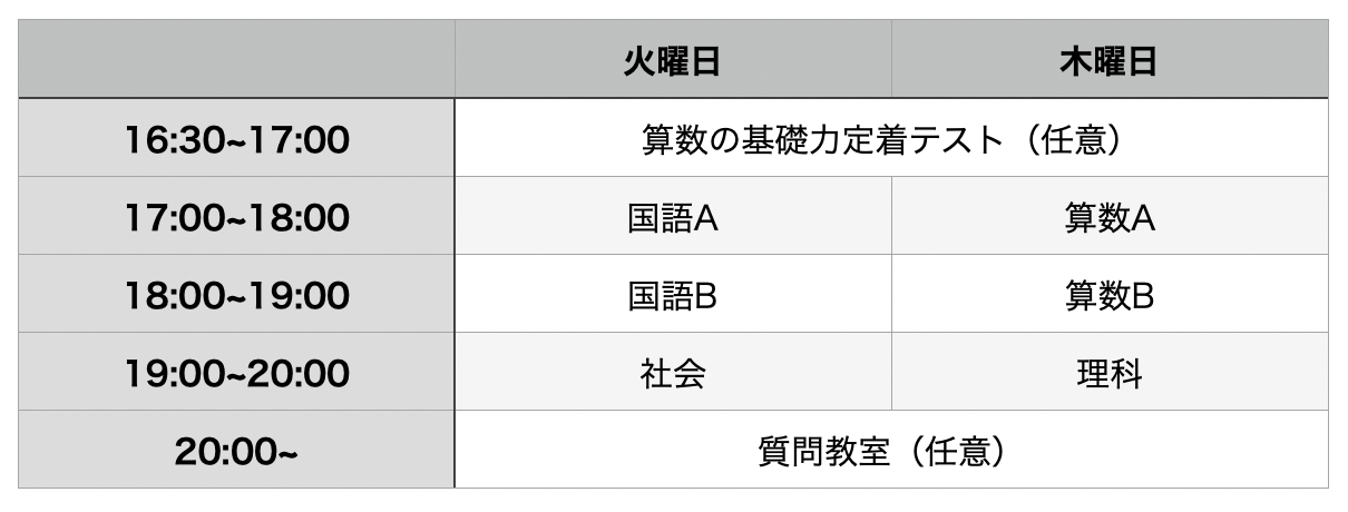 時間割は校舎によって変わりますが、首都圏の4年生はほぼ火曜と木曜の授業だと思います。通う校舎に確認をお願いいたします。