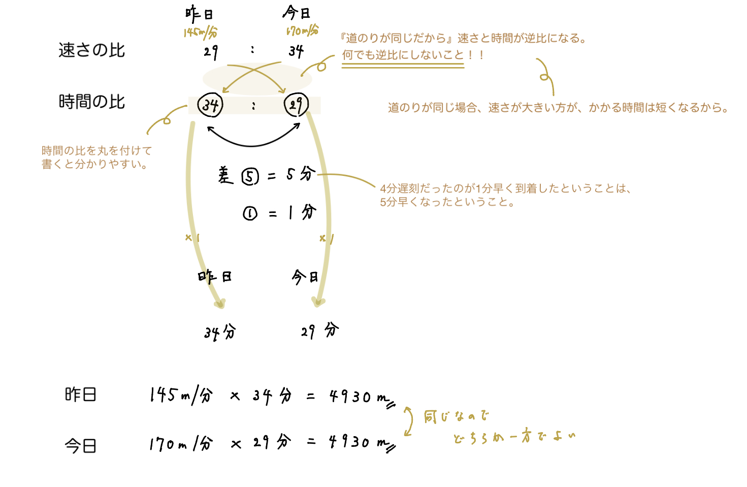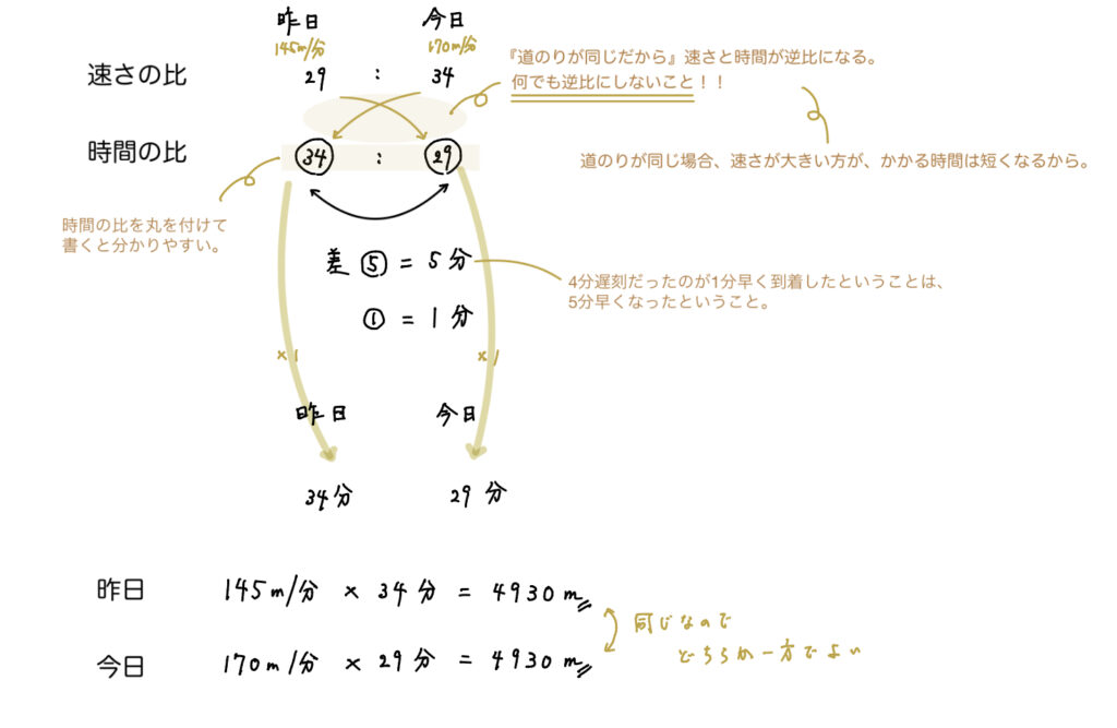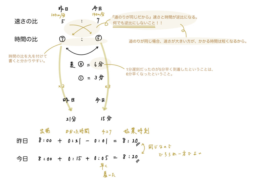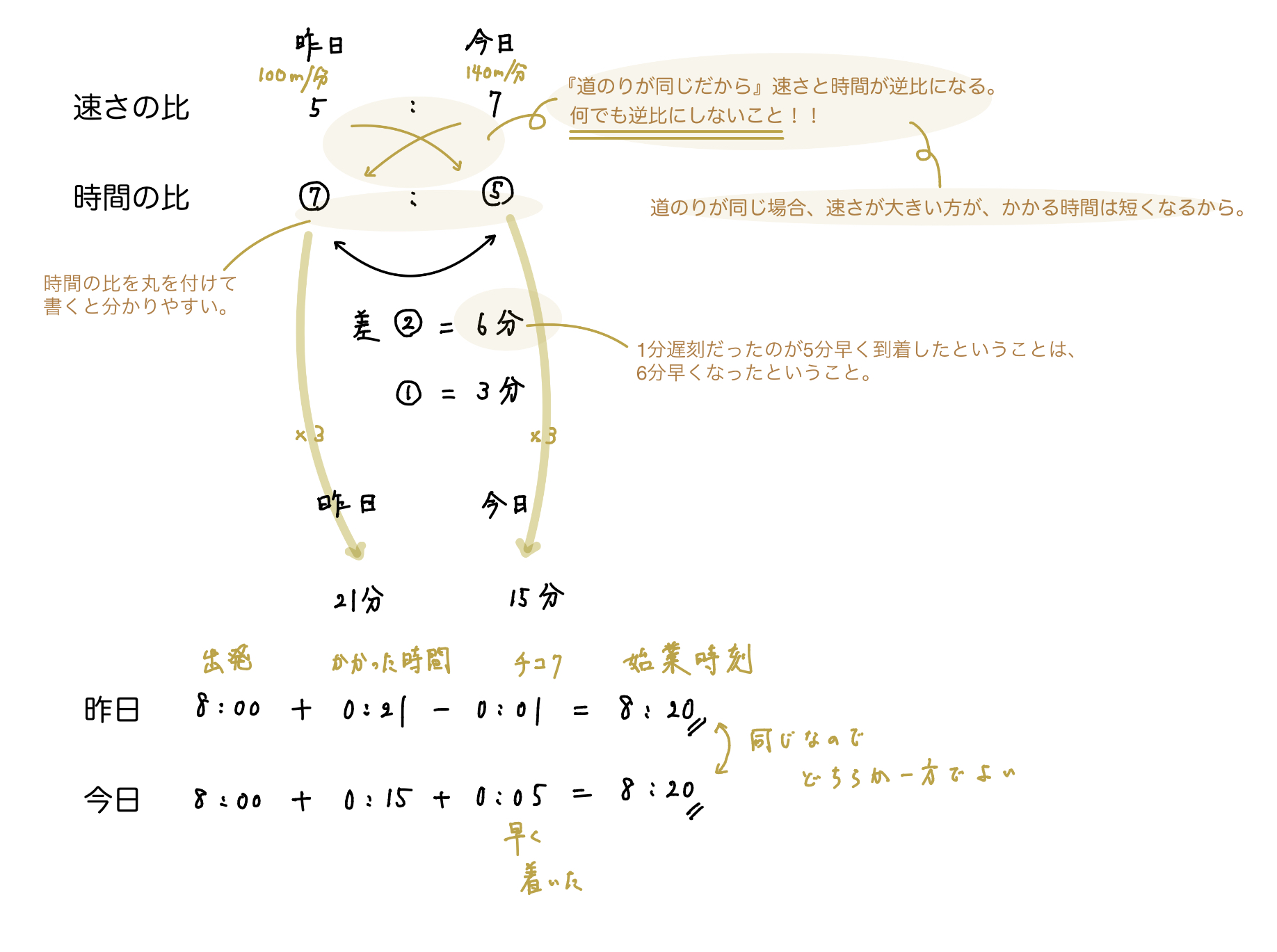 ① 速さの比を時間の比に変えることが遅刻算のポイント。このとき逆比になるが、意味を考えず、何でも逆比にする癖をつけるのはよくないので注意。