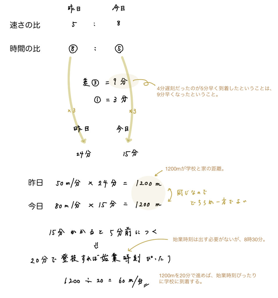 【パターン③ 速さを答える】ロウキ君は毎日8時10分に家を出て、学校に通っています。昨日は分速50mで向かったところ、始業時刻に4分遅れてしまったので、今日は分速80mで向かったところ、始業時刻の5分前に到着しました。始業時刻ちょうどに到着するには分速何mで進めばよいですか。