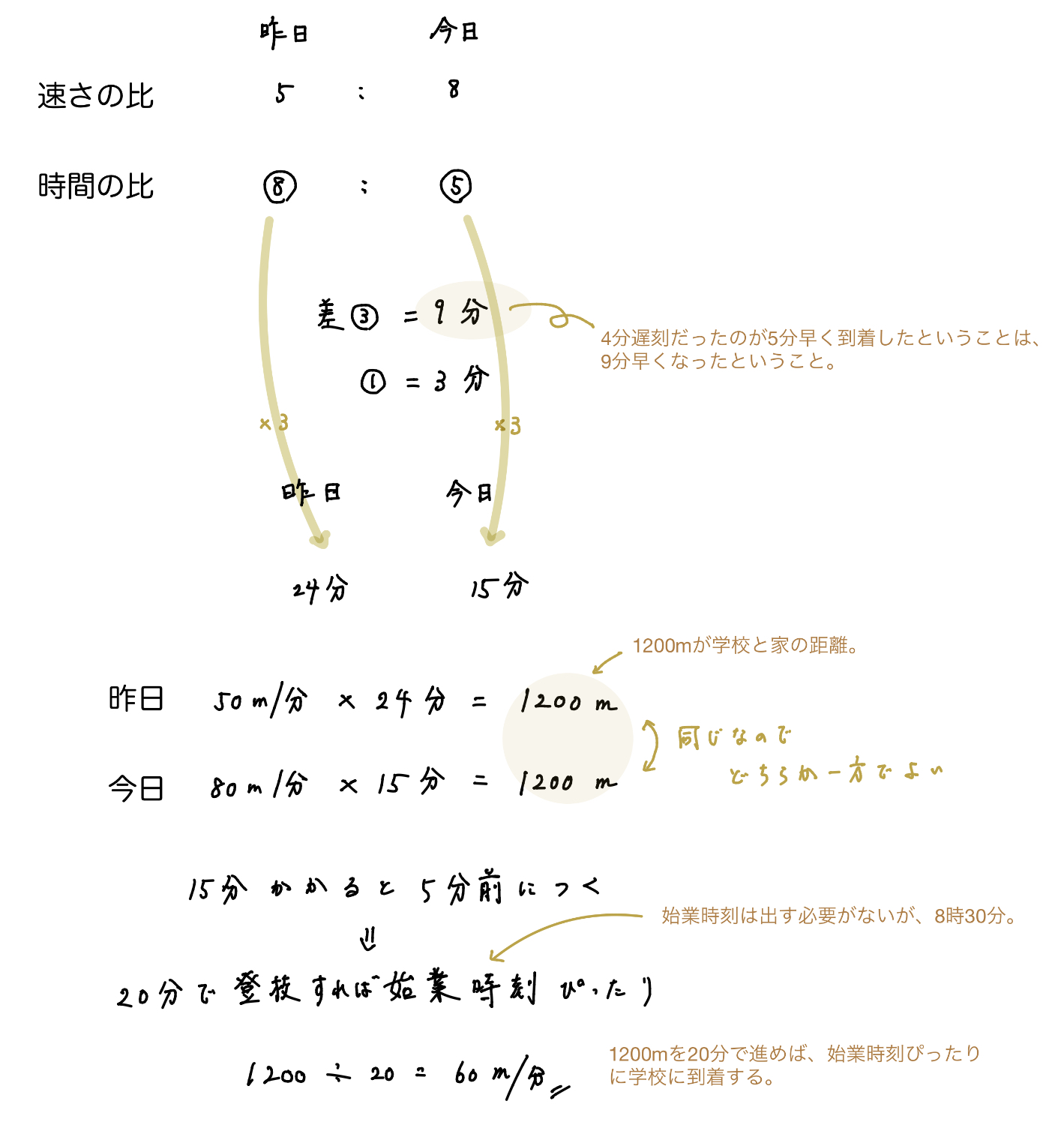 ③ あまり出題されるパターンではないですが、①と②のパターンがしっかり分かっていれば、ほとんど同じ手順で解けます。学校までの距離と、始業時刻の両方求めれば、簡単に解けます。